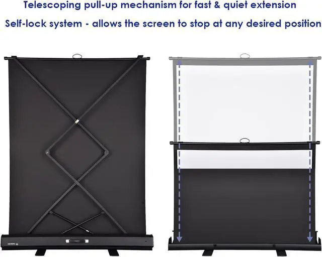 - Pull-out to Use - Self-standing design with stable feet and telescoping pull-up mechanism that provides fast & quiet extension while the self-lock system allows the screen to stop at any desired position when you pull up to suit your preference