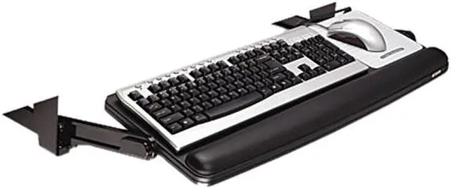 Underdesk keyboard tray provides height and tilt adjustment below desk for standard workstations. Wide platform places mouse next to keyboard for added comfort. Mouse cord guard keeps mouse from falling off. Mousing surface can be used to the left or right of the keyboard. Keyboard drawer will work in standard workstations. Includes 17" track, full-width gel wrist rest and Precise Optical Mousing Surface. Wrist rest has antimicrobial protection.