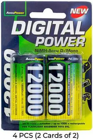 4-Pack D AccuPower NiMH 12000mAh Battery (2 Cards of 2)