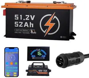 48V (51.2V) 52AH Lithium Golf Cart Battery, with 15A Charger, Lifepo4 Battery Kit, Built-in 100A BMS, with Bluetooth Mobile APP & Display Monitor, 4000 Cycles, for Golf Carts, Trolling Motors