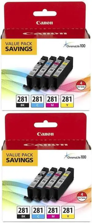 Canon 2 Pack CLI-281 BKCMY Combo 4-Pack of Black, Cyan, Magenta, and Yellow Ink Tanks for Pixma Inkjet Printers