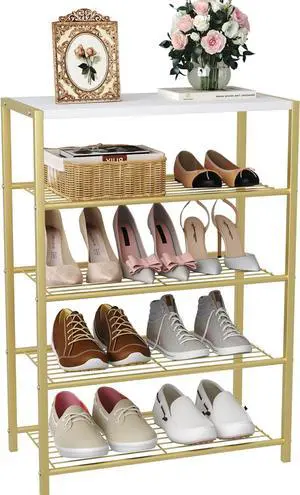 HOMEFORT Shoe Rack 5-Tier, Shoe Storage Shelf, Industrial Shoe Tower, Narrow Shoe Organizer for Closet Entryway, Small Shoe Rack Table with Durable Metal Shelves, Gold