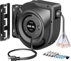 DEWENWILS Retractable Extension Cord Reel, 60FT Retractable Cord Reel, 12AWG/3C SJTOW, Lighted Triple Tap Outlets, 15A Circuit Breaker, Wall/Ceiling Mounted Heavy Duty Power Cord