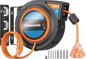 DEWENWILS 45FT Retractable Extension Cord Reel, 14/3C SJTW Heavy Duty Power Cord, Lighted Triple Outlets, 15A Circuit Breaker, Lightweight 180° Swivel Bracket, Ceiling/Wall Mount, ETL Listed, Orange