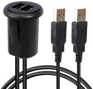 YM1240 2 Ports Dual USB 2.0 Male to Female AUX Flush Mount Car Mount Extension Cable with Buckle for Car Truck Boat Motorcycle Dashboard Panel