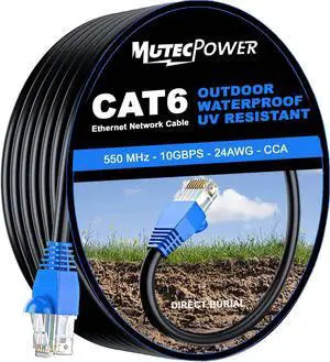 MutecPower 75m CAT6 Outdoor Waterproof Direct Burial Ethernet Network Cable - UTP - CCA - 550 Mhz - Black 75 Meter
