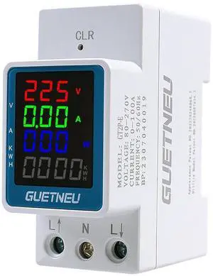 Color Digital Display Energy Meter Multifunction Tester AC Rail-Mounted Meter GT2P-E, AC 80~270V, 0~100A, 0~25KW, 50/60Hz. Measurement of AC Volts, Amps, Watts, Hertz, PF and Kilowatt-Hours