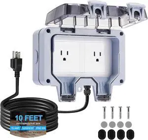 Outdoor Electrical Outlet Box w/ 10ft Extension Cord, NEMA 5-15R Outdoor Power Strip Weatherproof, STW 14 AWG, IP66 Waterproof Wall Power Socket with Cover, 2 Inch Deep, WRTR