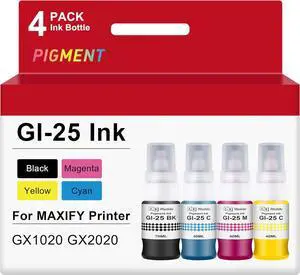 Pigment GI-25 GI25 Ink Refill Bottles Compatible for Canon 25 GI-25 Ink Bottles GI-25BK Work for Canon MAXIFY GX1020 GX2020 MegaTank Printer 190ml (4 Pack,Black/Cyan/Magenta/Yellow)