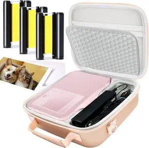 Compatible for Canon Selphy CP1500 CP1300 CP1200 Ink & Paper & Hard case, KP-108IN KP108 3 Color Ink Cartridges and 108 Sheets 4x6 Photo Paper and Rose Gold Case for Selphy CP1500 CP1300 CP1200