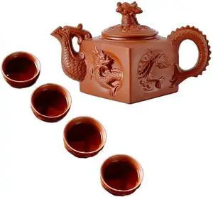 Purple Clay Chinese Tea Set Ceramic Teapot & 4 Tea Cups with Dragon & Phoenix Design Porcelain Tea Service for Home, Office, Gift (Red One Size)