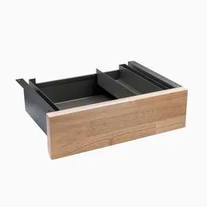 - Features: Customizable to match Desky sit-stand desk, Dual-level storage for office essentials and personal items, Easy installation in minutes, Declutters desktop, frees up workspace, Premium FSC wood front panel with hidden knife edge handle adds minimalist touch, Finishes match Desky sit-stand desks for sleek look, 10-year warranty protects against manufacturing defects, Smooth sliding mechanism for easy access, Hanging design provides additional space for notebooks and other items, Strong steel construction and powder-coated finish ensure durability.