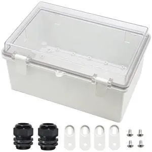 Junction Box,IP67 Waterproof Electrical Box Hinged Clear Cover Stainless Steel Buckle Plastic Enclosure for Project w Mounting Plate Wall Bracket and 2 Cable Gland 10.2 x 6.3 x 3.9 Inch