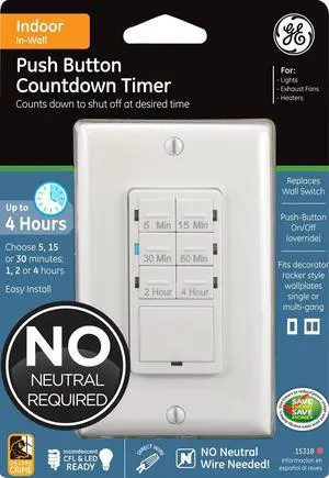 GE Push Button Digital Countdown Timer Switch, NO Neutral Wire Required, 5-15-30 Minute and 1-2-4 Hour Presets, On/Off, for Lights, Exhaust Fans, and Heaters, Décor Wall Plate Included, 15318, White