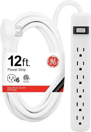 GE 6-Outlet Power Strip, 12 Ft Extension Cord, Flat Plug, Grounded, Integrated Circuit Breaker, 3-Prong, Wall Mount, UL Listed, White, 45195