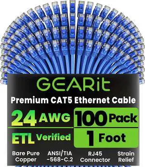 GearIT 100-Pack, Cat5e Ethernet Patch Cable 1 Foot - Snagless RJ45 Computer LAN Network Cord, Blue