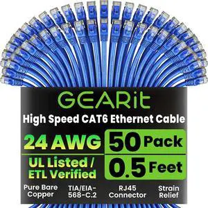 GEARit Cat 6 Ethernet Cable (50-Pack 3 Feet) Cat6 Network Patch, 10Gbps, RJ45, Snagless Cord, Gold-Plated Connectors, Internet for PC, TV, Tablet, Router, Printer, Servers, IT Data Center - Blue