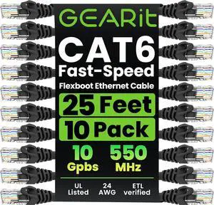 GearIT 10-Pack Cat6 Patch Cable 25 Feet Cat 6 Ethernet Cable Snagless Flexible Soft Tab - Preimum Series - Black