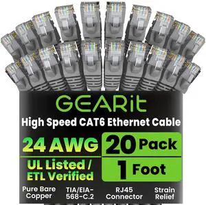 GearIT Cat 6 Ethernet Cable 1 ft (20-Pack) - Cat6 Patch Cable, Cat 6 Patch Cable, Cat6 Cable, Cat 6 Cable, Cat6 Ethernet Cable, Network Cable, Internet Cable - Gray 1 Foot