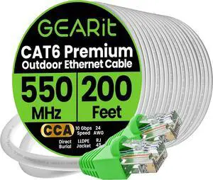 GEARit RJ45 Cat6 Ethernet Patch Cable, 10Gpbs Transfer Speed, Gold Plated Connectors, Copper Claired, Outdoor, UV Resistant, Direct Ground, Waterproof, Durable, 200 Feet (White)