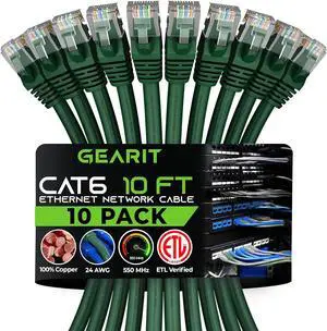 GearIT 10 Pack, Cat 6 Ethernet Cable Cat6 Snagless Patch 10 Feet - Computer LAN Network Cord, Green - Compatible with 10 Port Switch POE 10port Gigabit
