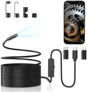 Dual Lens Endoscope Inspection Camera by , Dual HD Lens, IP68 Waterproof, 16.5FT/5M Semi-Rigid Cable, Borescope Camera with LED Lights, Compatible with Android and iOS Devices