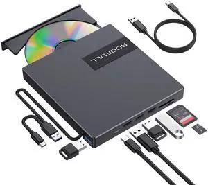 External CD DVD Drive with 4* USB Ports and 2* SD/TF Card Slot for Laptop, USB 3.0 Type-C CD-R/RW/ROM Reader Writer Burner DVD Player Disc Drive for PC Mac Windows 11/10 MacBook Linux Computer