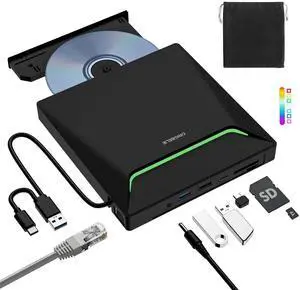 New External CD DVD Drive, Cool DVD Burner USB 3.0 with Ethernet Adapter, 3 USB and 2 TF/SD Card Ports, CD DVD Player Reader Writer Optical Disc Drive for Laptop PC Windows Mac with Carrying Case