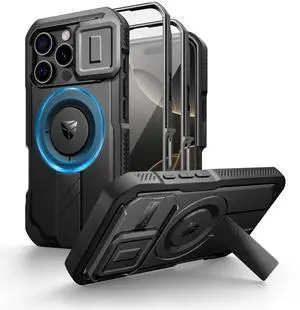 for iPhone 16 Pro Case with Slide Camera Cover & Adjustable Kickstand & Built-in Screen Protector,Compatible with MagSafe Shockproof Bumper Cases Heavy-Duty Magnetic Protective Cover,Black