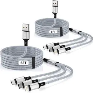Multi Charging Cable 2Pack 6FT 3 in 1 Multi USB Charger Cable Nylon Braided Multiple USB Fast Charging Cord Adapter Data Sync Lightning and Type C Micro USB Port Connectors For All Cell Phones Tablets