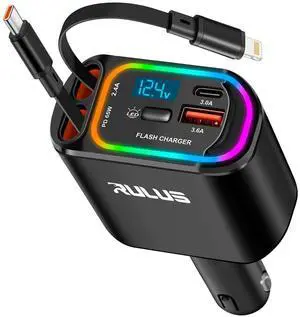 4 in 1 Retractable Car Charger,69W USB-C Fast Car Charger,for iPhone17/16/15/14/13/12,Cigarette Lighter Charger (Grey, for Apple+Type C &RGB [Black])