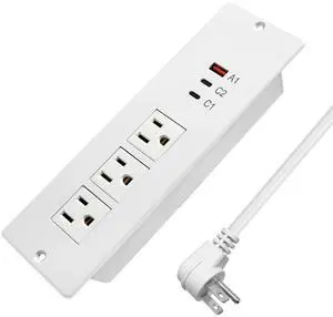 45W Recessed Power Strip USB C, Flush Mount Desk Extender 3 AC Outlets 2 PD USB-C&1 Fast Charge USB-A Ports,Flat Plug Extension Cord for Drawer Cabinet Countertop Table Conference White