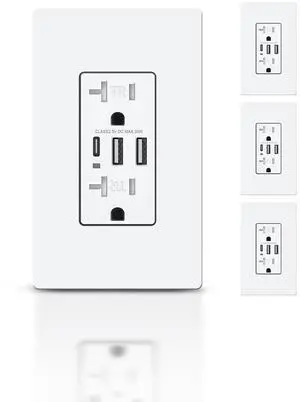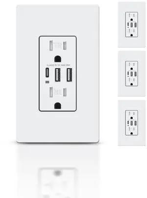 USB-C Wall Outlets, 6.0A Charging Power Outlet with 3 USB Ports, 20 Amp Duplex Tamper-Resistant Receptacle Plug, Screwless Plate Include, UL & FCC Listed, White, 4 Pack