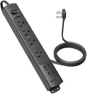 Flat Plug Power Strip USB-5ft Flat Extension Cord Surge Protector Wall Mount, 2 Type C & 2 USB A Ports with Multiple Outlets, 1440J, 1625W for Office Supplies Dorm Room Essentials, Black