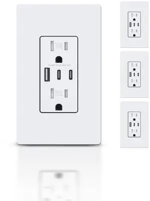 USB-C Wall Outlets, 6.0A Charging Power Outlet with 3 USB Ports, 20 Amp Duplex Tamper-Resistant Receptacle Plug, Screwless Plate Include, UL & FCC Listed, White, 4 Pack
