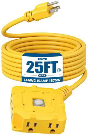 Features: This 25 Ft power extension cord is made by Watt's Wire and features a Triple (3) Outlets style with pvc material. It supports a voltage of 125 volts and an input current of . The cable is Yellow in color and is UL listed. It comes with a connector and does not require batteries.