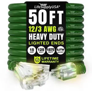 Features: This 50 FT power extension cord is made by LifeSupplyUSA and features a 1 Pack style with Copper material. It supports a voltage of 125 volts_of_alternating_current and an input current of . The cable is Green in color and is UL listed. It comes with a Male-to-Female connector and does not require batteries.