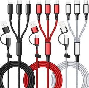 6 in 1 Multi Charging Cable [3Pack 4FT] Nylon Braided Multi Fast Charging Cord USB A/C to Phone USB C/Micro USB/i-P Connector Universal Multiple Phone Charger