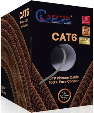 NewYork Cables | CAT6 Plenum Cable 1000ft Grey UL & ETL Listed CMP 100% Pure Copper, UTP, 550MHz, 23AWG, 4Pair, 10GB Ethernet Cable | Most Certified Plenum-Rated Fire-Resistant Bulk Cat 6 Cable