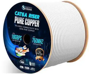 Smartech Cables | Cat6A Riser Cable 1000ft | ETL Listed | 100% Solid Bare Copper | Cat 6A Ethernet Cable | UTP, 23 AWG, 750 MHz, PoE++, 10Gb High Speed for Networking & Gaming - White