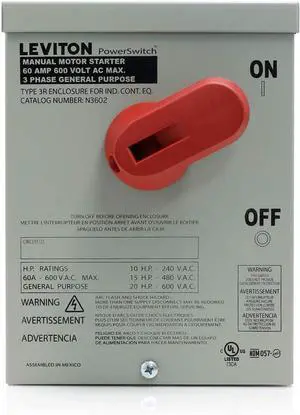 Leviton 60 Amp, 600 Volt, 2-Pole, Single Phase Single Throw, AC Manual Motor Controller, Standard Toggle, Industrial Grade, Non-Grounding, Back Wired, MS602-BW, Black