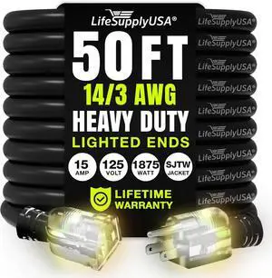 50ft Outdoor/Indoor Extension Cord 14/3 Gauge Heavy Duty 3 Prong SJTW, Waterproof, Flexible Cold-Resistant Long Power Cord,15A 125V 1875W, Black by LifeSupplyUSA