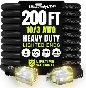 200ft Outdoor/Indoor Extension Cord 10/3 Gauge Ultra Heavy Duty 3 Prong SJTW, Waterproof, Flexible Cold-Resistant Long Power Cord,10A 125V 1000W, Black by LifeSupplyUSA