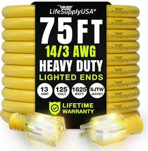 75ft Outdoor/Indoor Extension Cord 14/3 Gauge Heavy Duty 3 Prong SJTW, Waterproof, Flexible Cold-Resistant Long Power Cord,13A 125V 1625W, Yellow by LifeSupplyUSA