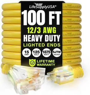 100ft Outdoor/Indoor Extension Cord 3-Outlet 12/3 Gauge Extra Heavy Duty 3 Prong SJTW, Waterproof, Flexible Cold-Resistant Long Power Cord,15A 125V 1875W, Yellow by LifeSupplyUSA