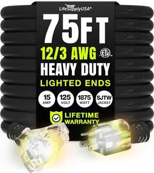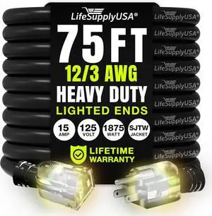 75ft Outdoor/Indoor Extension Cord 12/3 Gauge Extra Heavy Duty 3 Prong SJTW, Waterproof, Flexible Cold-Resistant Long Power Cord,15A 125V 1875W, Black by LifeSupplyUSA
