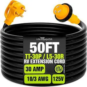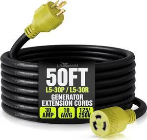 50ft Generator Extension Cord 30 AMP 3-Prong (L5-30P / L5-30R) - 10AWG3 125V STW - Hook and Loop Strap ETL by LifeSupplyUSA