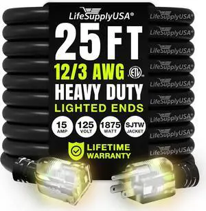 25ft Outdoor/Indoor Extension Cord 12/3 Gauge Extra Heavy Duty 3 Prong SJTW, Waterproof, ETL Listed, Flexible Cold-Resistant Long Power Cord,15A 125V 1875W, Black by LifeSupplyUSA