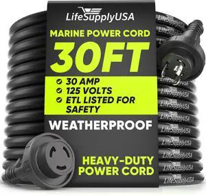 30FT Marine Shore Power Cord 30 Amp, NEMA L5-30P to L5-30R Twist Lock, 125V 10AWG SJTW Extension Cable with Lighted Connector, ETL Listed for Boat RV Dock by LifeSupplyUSA