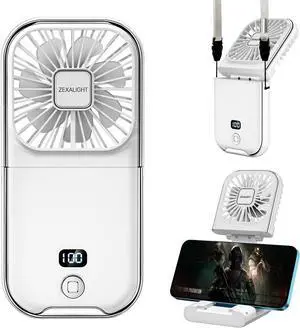 5-in-1 Portable Handheld Fan, Necklace Fan, Mini Desk Fan, Foldable Phone Stand, Emergency Backup Power, Quiet USB Rechargeable Personal Fans with LED Digital Screen (White)